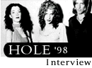 Celebrity Skin is, Love agrees, Hole's Hotel California (referring to the 1976 hit album by the Eagles), a classic Southern California rock album that references everything from X's Los Angeles (the cover art is a black and white photo of the group in front of a burning palm tree) to the Byrds' "So You Want To Be A Rock 'N' Roll Star" and the Doors' "L.A. Woman." Here, now, Love is in full effect. It feels as though she's bouncing off the walls, as if the energy is dripping off her like the water from her still-wet hair (she was up all night at a video shoot for the album's title track) as she takes over the room, a small studio used to record radio interviews. Within moments of her arrival she has someone fetching an ashtray while someone else finds her a Diet Coke. Her bandmates seem comfortable with Love dominating the proceedings. (Present are guitarist Melissa Auf Der Maur and bassist Eric Erlandson. Absent are drummer Patty Schemel, who's taking a leave to work on "some personal issues," according to Merlis, and Samantha Maloney, who's temporarily filling in for Schemel.) |